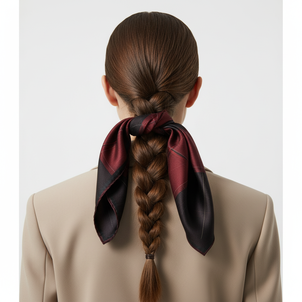 100% silk twill scarf in classic argyle pattern, sized at 28" x 28". Features hand-rolled edges and arrives in custom packaging. Dry clean for best results.
