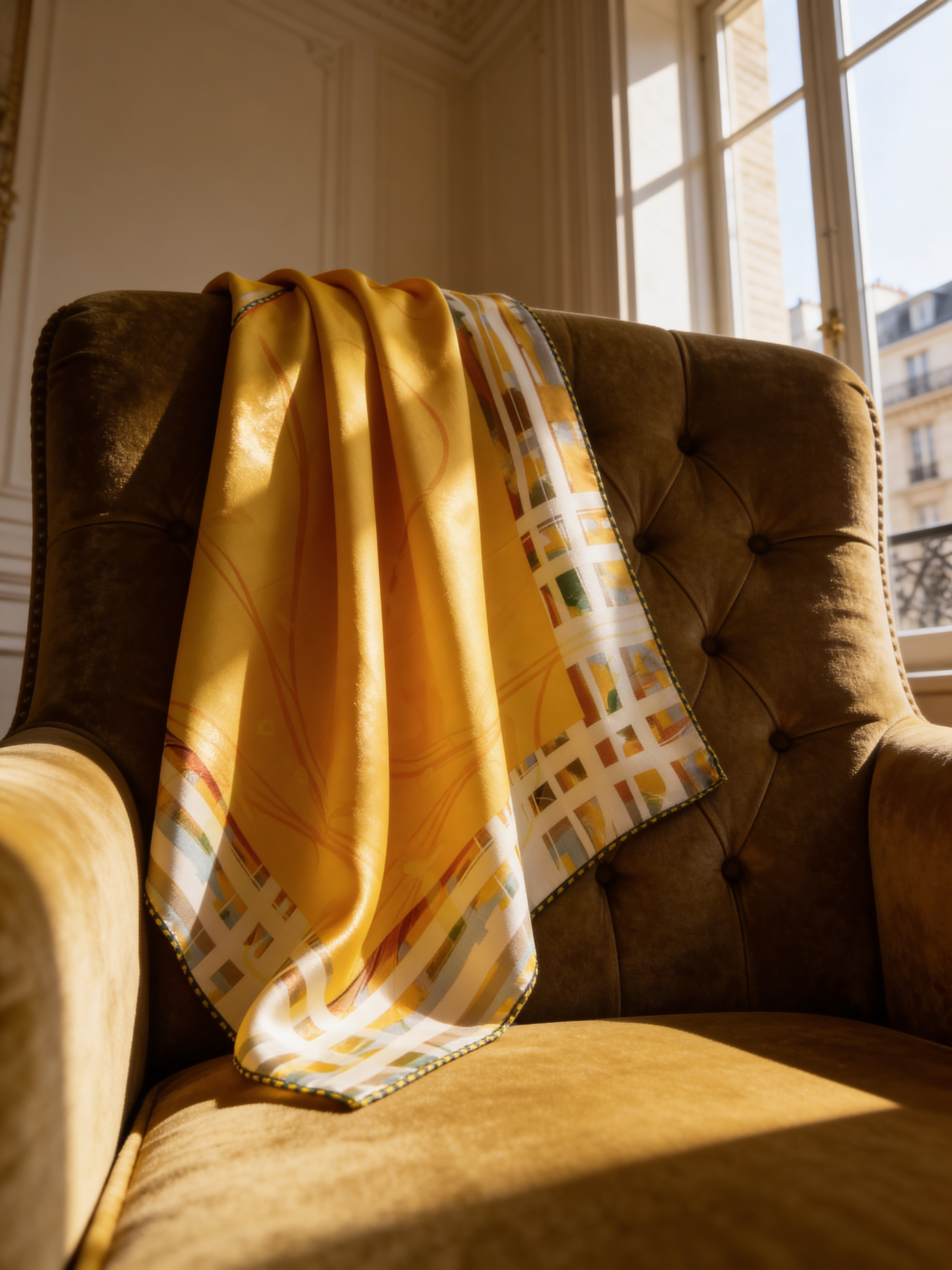 Featuring an abstract sunflower design in luminous yellow tones capturing the essence of the season's awakening, offering a polished way to elevate your early spring wardrobe with artistic flair and timeless elegance.